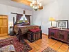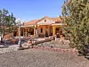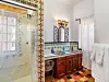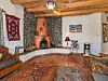 A separate living room is where the second kiva fireplace — this one, smooth and orange — is tucked into a corner made of cobblestones. Warm wooden ceilings, orange Saltillo floor tiles and colorfully elaborate bathroom tiles are other prominent design features found throughout the home.