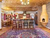 The custom features continue inside the home, where a smooth yellow kiva fireplace encapsulates a corner made of brick. Close by is the kitchen, where brick islands topped with stone slabs accompany a stove covered by a cobblestone hood.