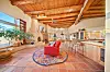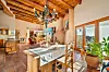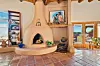 The five-bedroom, four-bathroom home features high ceilings, exposed vigas and a kiva fireplace