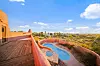 The two-story home comes with five bedrooms, four bathrooms, a three-car garage and a pool and hot tub. It features a Pueblo Revival style with design elements including high ceilings, exposed vigas and a kiva fireplace.