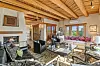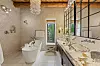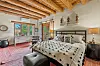 The interior offers several traditional Santa Fe design elements, including hardwood and brick floors; hand-carved doors; kiva fireplaces; coved ceilings adorned with thin sticks known as latillas and larger beams known as vigas; plaster; antique sconces; and colorful Mexican tiles.