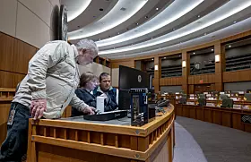 From left, Robert Chavez, Kayla Stuhlmann and Leo Gonzales, all work with IT for the Legislative Council Service, work on issues with the web casting in the House Chambers, Friday, January 16, 2026. Dozens of people were busy getting ready for the start of the 2026 legislative session on Tuesday.Eddie Moore/Journal