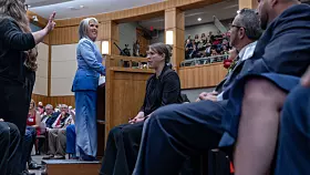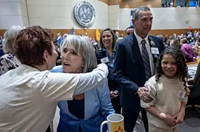 Gov. Michelle Lujan Grisham, center, hugs Patricia Aguirre, from Las Cruces, as she leaves the House Chambers after giving her final State of the State address to a joint session of the House and Senate, Tuesday, January 20, 2026.Eddie Moore/Journal