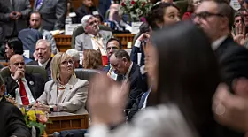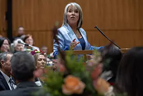 House Min. Leader Gail Armstrong, R-Magdalena, second from left, and other Republican legislators, sit quietly as others applaud Gov. Michelle Lujan Grisham for suggesting an assault weapons ban during her final State of the State address to a joint session of the House and Senate, in the House Chambers, Tuesday, January 20, 2026.Eddie Moore/Journal