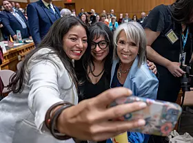 Gov. Michelle Lujan Grisham, right, takes a selfie with Representatives Andrea Romero, D-Santa Fe, left, and Kristina Ortez, D-Taos, as she leaves the House Chambers after giving her final State of the State address to a joint session of the House and Senate, Tuesday, January 20, 2026.Eddie Moore/Journal