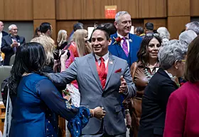 Lt. Gov. Howie Morales, center, greets House Maj. Leader Reena Szczepanski as the Senate enters the House Chambers to hear Gov. Michelle Lujan Grisham giving her final State of the State address, Tuesday, January 20, 2026.Eddie Moore/Journal
