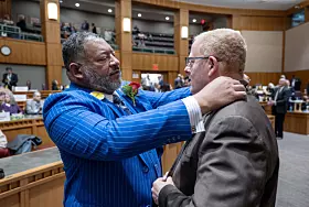 Sen. Harold Pope, D-Albuquerque, left, helps Sen. Jeff Steinborn, D-Las Cruces, with his collar on the first day of the 2026 legislative session, Tuesday, January 20, 2026.Eddie Moore/Journal