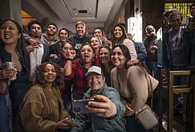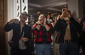 Mayor Tim Keller takes photos with his supporters after being re-elected as the Mayor of Albuquerque for the third time during his election party at the Clyde Hotel in Downtown Albuquerque, N.M., on Tuesday, Dec. 9, 2025.