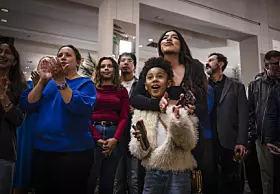Fabiola Landeros, center, reacts as Mayor Tim Keller enters the room after winning re-election for a third term as Albuquerque’s mayor at the Clyde Hotel in Downtown Albuquerque on Tuesday, Dec. 9, 2025.