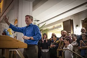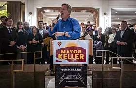 Mayor Tim Keller speaks to his supporters after being re-elected as the Mayor of Albuquerque for the third time during his election party at the Clyde Hotel in Downtown Albuquerque, N.M., on Tuesday, Dec. 9, 2025.