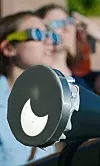 The partial solar eclipse is projected on a membrane at the end of a oil funnel from the eyepiece of Dee Friesen's 6 inch Orion reflector telescope at the New Mexico Museum of Natural History & Science on Thursday, October 23, 2013. Watching with protective sunglasses are Samantha Abbott, left, and Kristen Newcomer, both of San Marcos, Texas.GREG SORBER