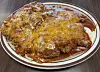 The aforementioned Vaqueros ($15.99) highlights a list of Breakfast Specials at the top of the menu. The craggy-surfaced chicken-fried steak took up almost all of the shallow oval bowl it was served on. Under a cover of red sauce smothered with melted cheese, it resembled a plate of chicken parmigiana at first glance. But the peppery heat of the red chile that flooded the mouth after the first bite left no doubt that it’s a New Mexican dish, not Italian. The savory breading stayed crisp under the sauce, and the meat was more tender than tough. The two over-easy eggs underneath easily dispatched their runny yolks to enrich the sauce. Pushed over to one side of the plate were a pile of matchstick-like hash browns and some whole beans. Despite its prodigious size, the serving went down pretty easily.