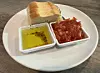 Our lunch began with a complimentary appetizer of four slices of bread served with cups of seasoned olive oil and a tomato-based bruschetta spread. The bread was fresh and light, the serving size modest enough to preserve our appetites.