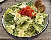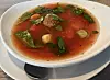 Served in a broad, shallow bowl, the soup was an impressive sight, with fresh spinach leaves floating on top of a fiery red broth. Presumably because it was a half-size portion, the broth held only one dense meatball and a few tortellini. A decent, if salty, soup that separated into two layers after a minute or two on the table.
