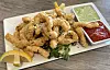 The five appetizers on the Lunch Menu cost $8 to $12. We shared the Fried Calamari ($13), a couple dozen breaded strips piled on a rectangular plate next to cups of marinara and a tasty pesto aioli. The tender calamari under a coating that was more crunchy than crisp was quite similar to the version they serve up in Rio Rancho.
