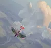 In “Flight of Four Over Rio Grande,” painted in 1968, he depicts four aircraft as they soar over the winding river.