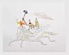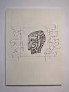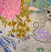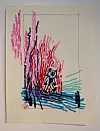 “Spirit Beam” looked at first glance like an old Chinese junk, whose sail is brightly patterned with a fluorescent orange, yellow and blue wood grain texture. Drayzen created this odd texture with Magic FX colored pencils that allowed him to draw in multiple colors without lifting his hand from the page. The boat part — or is it a balance beam? — has what I thought was Chinese writing on it, but which I later learned were representations of ancient Roman “dead nails,” or funerary charms. The “sail” part — or is it a curved beam of light? — has clusters of disembodied ghosts interspersed among the fluorescent markings.