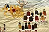 Many of Hudson’s quilts were inspired by Indigenous ledger art, an art form that began in the 19th century when old accounting ledgers were among the only sources of paper available to Indigenous artists. In those pieces, Hudson sews figures onto paragraphs of hand-stitched text to recreate the look of ledger art, as well as to create connections between words and images.