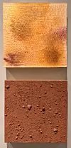 Wallace has been collecting dirt samples across New Mexico since 1981 — first, as a U.S. Forest Service archaeologist, then later as an artist. The dirt ranges in color from orange to dark gray to chalky white, and for each “Earth Elements” piece in the current show, she pairs a square of dirt from a specific collection site with a square-shaped resin painting containing said dirt. The resin paintings include additional colors, such as metallic blue, vegetal green, and fleshy pink and tan. Each stacked diptych looks like the “before” and “after” panels of a chemistry experiment: reactant versus product, chemical isolate versus chemical synthesis.