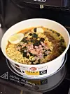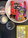 For my ramen, I selected a packet of Nongshim’s Shin Ramyun — an extra-spicy variety made with gochugaru, or Korean red chile pepper powder. The bright red package was emblazoned with an image of the pink-haired character, Mira, from “K-Pop Demon Hunters” — part of Nongshim’s recent bid to appeal to a younger demographic.