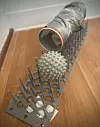 “Jock sneeze” is a floor piece consisting of — among other things — a spiky gray massage ball and a duct-tape-wrapped Pringles tube, both of which rest on a set of pest-repelling plastic spikes. Although the assemblage serves no function, it resembles a Rube Goldberg-esque mousetrap — goofy and absurd.