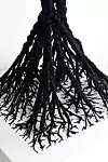The fragmentation of cultural identity is a running theme throughout “Truths Be Told.” We see it in Sonya Clark’s (no relation to Kathryn Clark) diptych of braided sculptures. Clark, an American artist of Afro-Caribbean descent, uses the Euro-American language of minimalism to confront the continued stigmatization of natural Black hairstyles. We also see it in the work of Marie Watt (Seneca and European), Nicholas Galanin (Tlingit and Unangax) and Cannupa Hanska Luger (Mandan, Hidatsa, Arikara, Lakota and European), whose fusion Indigenous and Euro-American art creates intentional aesthetic dissonance. Galanin’s “Language Removal Tools for Indian Children, Sheldon Jackson,” for instance, presents a pair of child-sized handcuffs etched with Indigenous designs — a pointed reference to the forced assimilation policies pursued by Canadian missionary and education official Sheldon Jackson in the late 19th century.