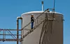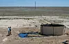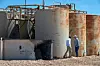 A condensate tank, used to hold liquids like produced water, located on the Horseshoe Gallup oilfield. The darker dirt around the tank may indicate soil contamination.Jon Austria