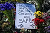 Some people held signs with messages such as "We See, Hear & Believe You" and "Justice for Survivors." Others planted crosses or put up drawings on the fence with messages honoring victims. One of the paintings showed the Statue of Liberty punching President Donald Trump in the face.