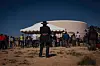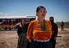 RIGHT: Ciara Chavez, 12, Sacorra Tenorio, 12, Hazel Mariano, 13, and Shaundrea Apachito, 12, students at To’hajiilee Community School, huddle together during the To’hajiilee water pipeline project groundbreaking ceremony on May 15. The $20 million, 7.5-mile pipeline will bring safe drinking water to the Navajo community of To’hajiilee.