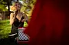 University of New Mexico student Madison McLean drums on a bucket with musicians with the UNM Colectivo Son Jarocho on Tuesday at the solidarity encampment at the Duck Pond on the school's main campus in Albuquerque.Chancey Bush
