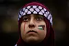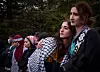 Safa Kassem, who is a medical lab science student from Yemen, listens to speakers during a silent protest calling for immediate ceasefire in Palestine at the University of New Mexico Health Sciences campus in Albuquerque, N.M., on Friday, Nov. 10, 2023.Chancey Bush